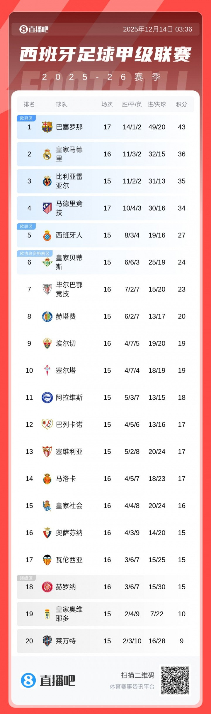 直播吧12月14日讯西甲第16轮,巴萨2-0奥萨苏纳。最新的积分榜方面:巴萨先赛7分优势领跑,第2的皇马明日凌晨客战阿拉维斯,黄潜第3,马竞第4。